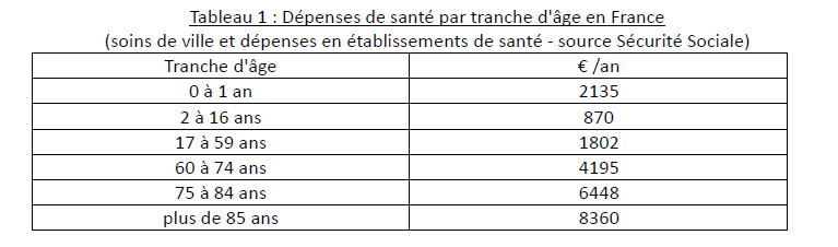 Le vieillissement démographique aboutit presque mécaniquement à une hausse des dépenses de santé, qui sont croissantes avec l'âge (Tableau 1) à partir de la tranche d'âge 17-59 ans .